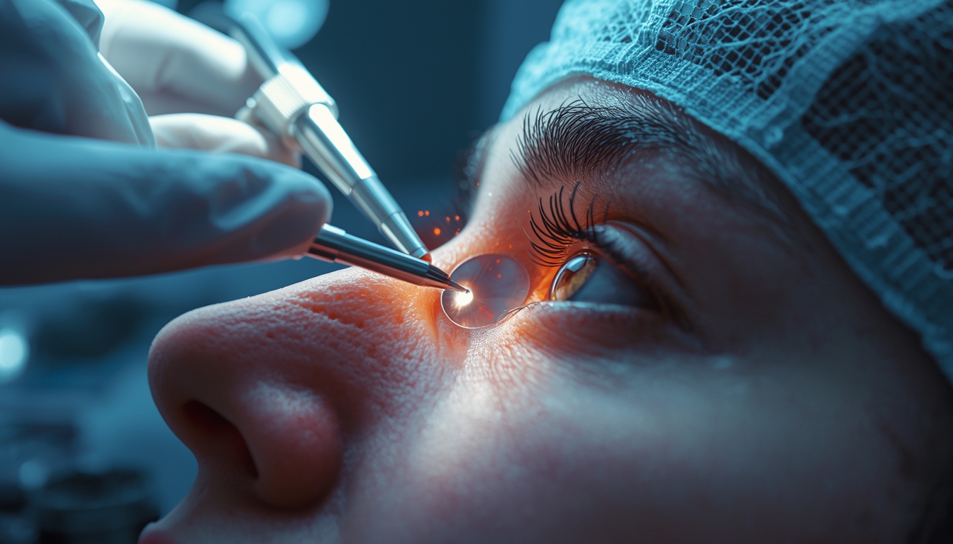 The probe emits ultrasound waves to break the cloudy lens into tiny fragments, which are then suctioned out. A premium foldable IOL is injected through the same tiny incision and unfolds inside the eye.